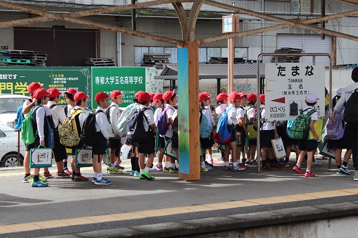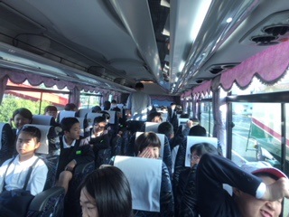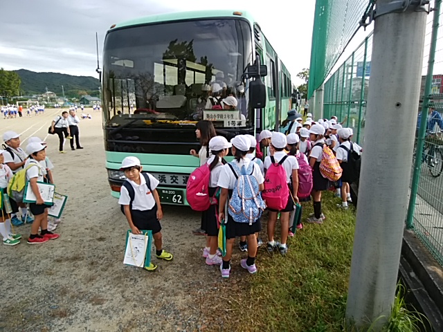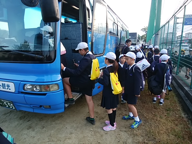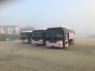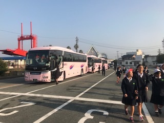 <出発式>バスの安全を願って運転手さんにあいさつをしました。