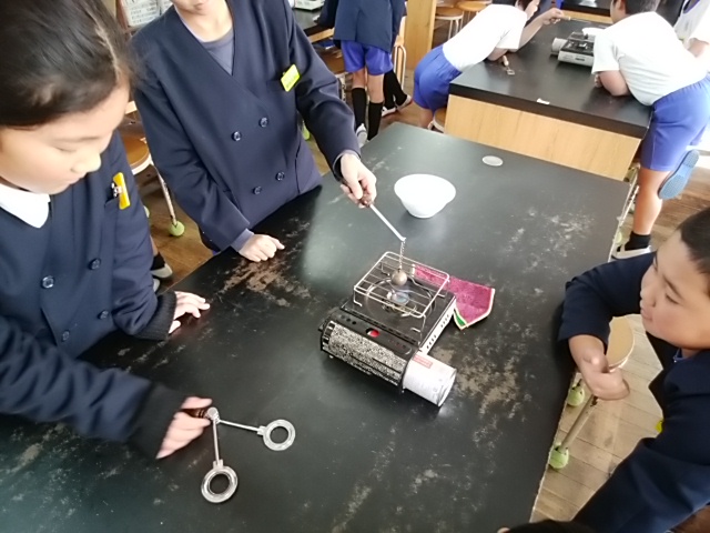 11月28日(火)4年生が、はじめて理科室で実験をしました。金属をあたためると、