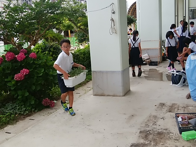園芸飼育委員会が、プランターの移動などをがんばっていました。
