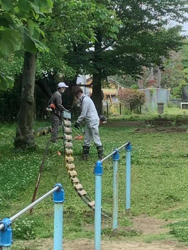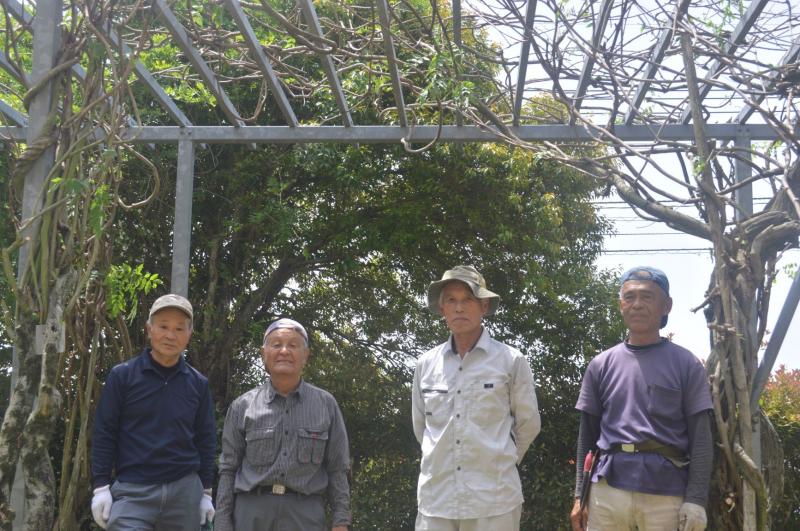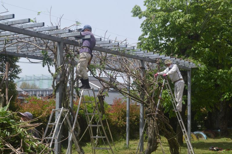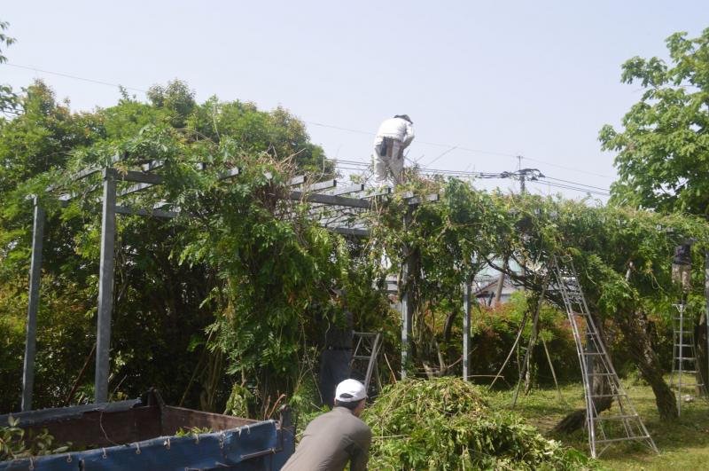 5月9日(日)区長さんはじめ地域のボランティアの方々に藤棚の藤の伐採をしていただきました。