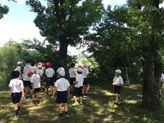 写真は、昨日の昼休みの様子です。一年生は、腐葉土を掘って幼虫を探しています。高学年は、クヌギの木からクワガタを探しています。