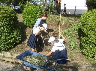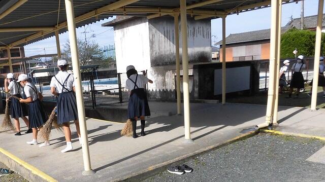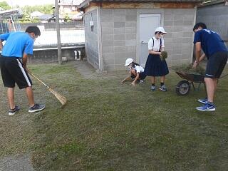 そして、27日(月)朝、6年生の子供達が、刈ってあった草をボランティアできれいに片づけてくれました。重ねてありがとうございました。写真は、子供達のボランティアの様子です。