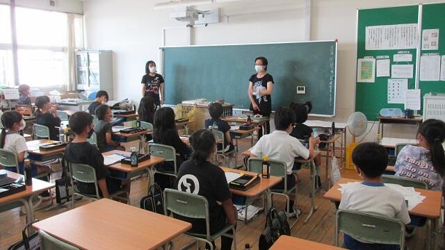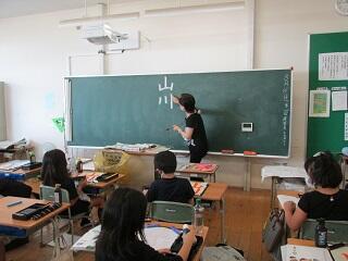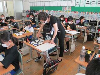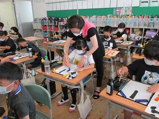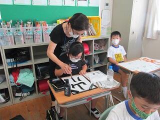 8月31日(水)以前からお世話になっている土井先生にゲストティーチャーとして習字の指導をしていただきました。今回は、「山川」でした。先生が一人一人にお手本を作ってくださり、立派な作品が出来上がりました。ご指導大変ありがとうございました。