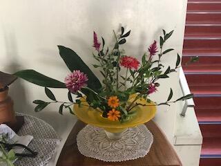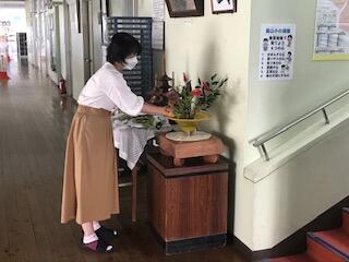 本校の玄関から校舎内に入ると、正面に生け花がいけてあります。この生け花は、本校職員が、毎朝生けているものです。本当にありがたいと感じています。もし学校においでの際は、ぜひご覧になってください。写真は、今朝の様子です。