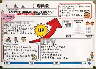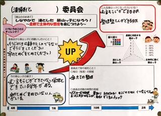 築山小学校では、学校教育目標を「しなやかで凛とした子供の育成」育てたい力を「柔軟性、主体性」として、日々の教育活動に取り組んでいます。今日は委員会活動で「主体性」を育む取組を紹介します。委員会活動では、年度初めに成長モデル(目標設定シート?)を作成して、子供たちが主体的に課題解決に取り組めるようにしています。①現状(課題)の把握、②育ってほしい姿、③お願いしたいこと、④委員会としての取組、の4つの項目をみんなで協議して記入しています。