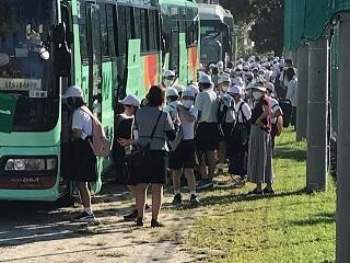 15日(木)朝、8時、6年生が長崎修学旅行へ出発しました。心配された台風は大丈夫のようですが、暑さが厳しくなりそうなので、熱中症が心配です。出発式では、企画委員会の児童の進行で、修学旅行の意義や健康や行動での注意点を確認して、みんな元気よく出発していきました。