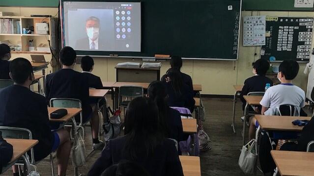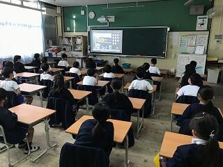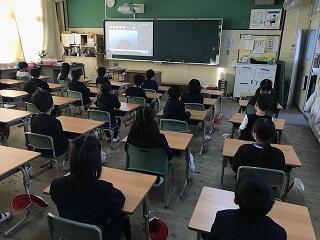 今日のオンライン集会は、保健委員会による発表でした。コロナ予防のための感染対策について、詳しく説明し呼びかけをしてくれました。最近じわじわ感染者が増えてきています。感染対策を徹底して、予防しましょう。写真は、1年3組と2組の様子です。