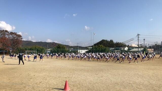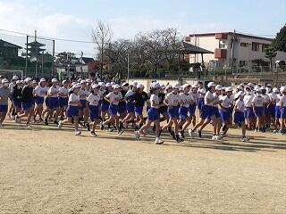 13日(火)の4校時高学年の持久走大会でした。スタート時の様子を紹介します。写真は、準備運動の様子と5年男女、6年男女別のスタート直後です。