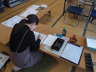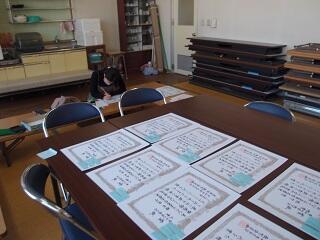 15日(木)築山小の子供達が、受賞した100枚ほどの賞状の氏名書きを4名のボランティアさんにしていただきました。写真は、学校に来て書いて頂いている様子です。このほかに3名の方が、自宅で書いて頂きました。大変ありがとうございました。