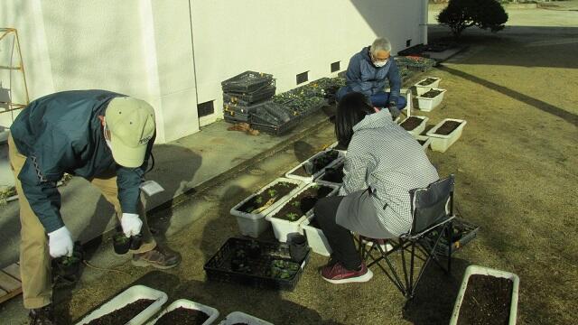 22日(木)4名のボランティアでプランターにパンジーとビオラの苗を植えました。プランターが40個できました。その後、校門前の花壇を3年生が植えやすいように草取りもしてくださいました。
