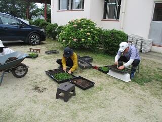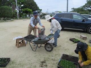 本日(5/25)、花植えボランティアを地域の方々5名で行っていただきました。マリーゴールとナデシコの苗を、育苗箱からポットへの植え替えをしていただきました。