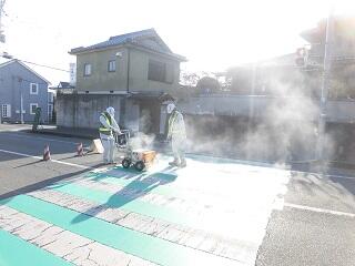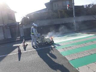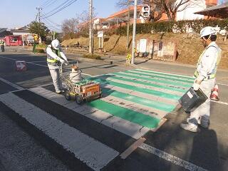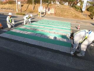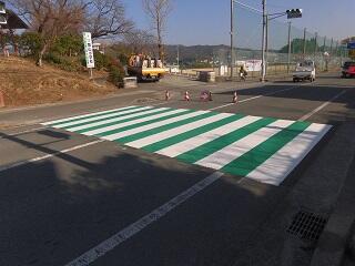 本日の午前中に、正門前の横断歩道のカラー舗装工事が行われました。正門前の横断歩道は多くの児童や地域の方が横断し、車の往来も多くあります。今回のカラー舗装が交通事故防止によい影響を与えると思っています。横断歩道のカラー舗装に向けてご尽力いただいた地域の方々にお礼申し上げます。