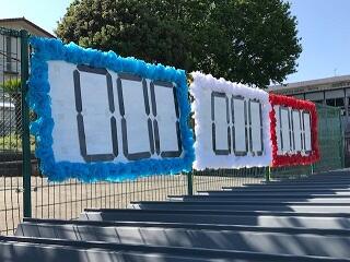 【ドローンで撮影した150周年記念の全校児童・職員による人文字】