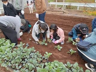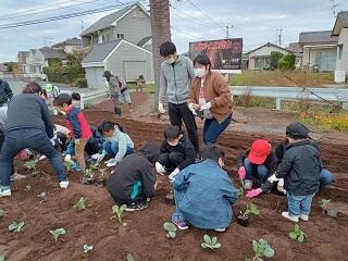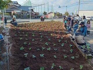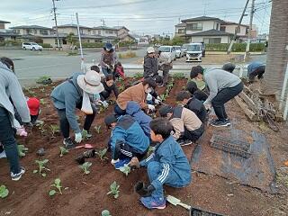 11月19日(日)の朝、「築山支館花づくり部会」の呼びかけにより築山小学校の親子10組(25名程度)が校区の2カ所の花壇に葉ボタンの苗を植えました。地域の方と一緒に楽しい時間を過ごし、地域を愛する心が育ちました。