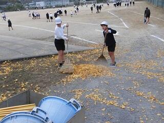 なかよし学級の児童や4年生を中心に、朝から校舎まわりの落ち葉集めを頑張っています。本日は持久走大会で走る正門前の坂道の銀杏の落ち葉をたくさん集めてくれました。愛校心の心が育っています。