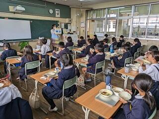 本日の給食時、4年生教室に玉名市中央給食センターから2名の栄養教諭が来校されました。冬至には「ん」のつく食物を食べると1年間健康に過ごすことができるなどの話でした。子どもたちも興味深く真剣に聞いていました。