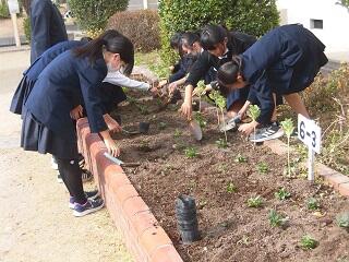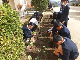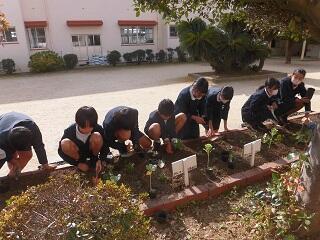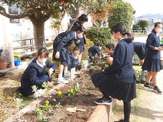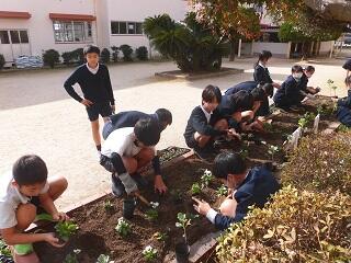 本日、6年生の児童が職員玄関前の花壇に花(パンジー、葉ボタン等)の苗植えをしました。来校される方々をきれいな花でお迎えできることを嬉しく思います。