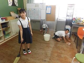 築山小学校では「しなやかで凛とした子どもの育成」を目指して、みんなでそうじを頑張っています。自分たちの学校をきれいにする愛校心が育っています。ぞうきんも各学級できれいに並べて、干しています。