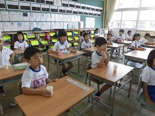 フッ化物洗口による虫歯予防を築山小学校では毎週金曜日に実施しています。フッ化物洗口ボランティアの方々の協力により、各学級でスムーズに洗口が行われています。1年生も上手にできるようになりました。