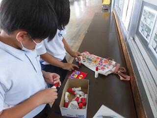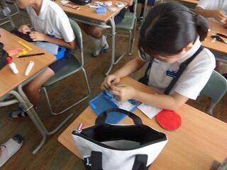 5年生では家庭科の学習がはじまり、裁縫の学習を行っています。針に糸を通すこと、玉留め、玉結びなど手先を起用に使って上手にコースターを作っていました。