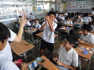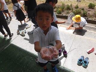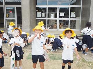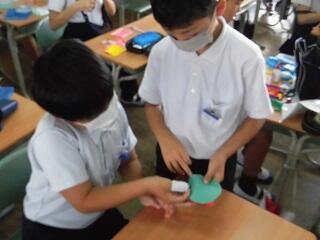 1年生では生活科の学習でシャボン玉づくりを行いました。紙を貼っていないうちわやトイレットペーパーの芯、太さの違うストローなどつかってきれいなシャボン玉をつくり大喜びでした。