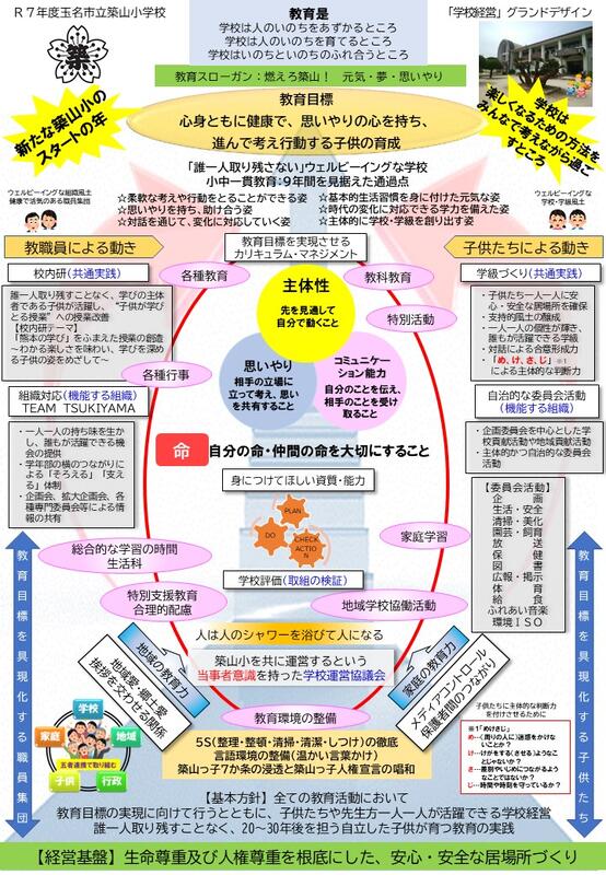 また、本年度は、築山小学校の新たな未来に向けての一歩を踏み出す年と考えています。昨年創立150周年という大きな節目を迎えました。これまでの歴史に積み上げられた伝統を大切にするとともに、これからの未来を担っていく子供たちが、自ら考え依行動し、主体的に学校や地域社会を創り上げていき、新たな歴史を刻んでいくことを願っています。