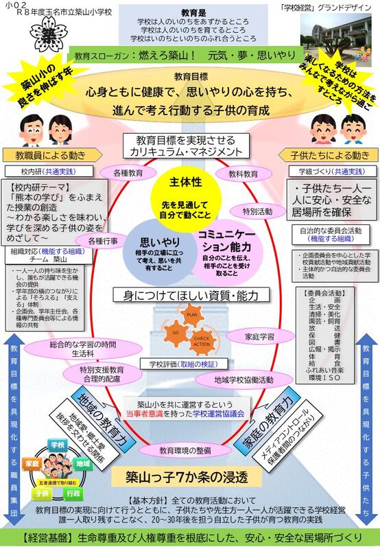 また、本年度は、築山小学校の新たな未来に向けての1歩を踏み出す一年と考えています。これまでの歴史に積み上げられた伝統を大切にするとともに、これからの未来を担っていく子供たちが、自ら考え行動し、主体的に学校や地域社会を創り上げていき、新たな歴史を刻んでいくことを願っています。