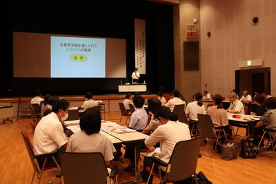 午前中には人権教育に関する研修を行い、「児童生徒が課題を乗り越え、自己肯定感を高めるためにどのような取組が必要か」という協議の柱のもと、小中学校での人権教育のレポートを読み、話し合いをしました。また、熊本県教育庁市町村教育局 人権同和教育課の内布亜紀指導主事にお越しいただき、「指導方法等の工夫・改善に関すること([第三次とりまとめ]、3つのアプローチパンフレット)」についてご講話をいただきました。