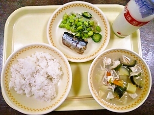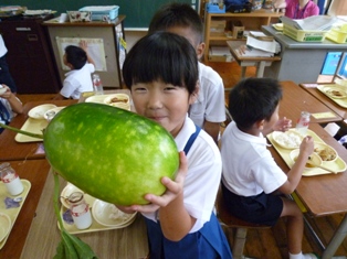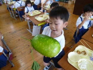 今日の給食は、かぼちゃのみそ汁です。みなさんは、地産地消という言葉を知っていますか?地産地消とは、地元で作られた食べ物を、地元で食べることです。今日のかぼちゃは、みなさんが住んでいる津奈木町で作られたかぼちゃです。地元で育てられた、おいしくて新鮮なかぼちゃです。味わって食べてみて下さいね。