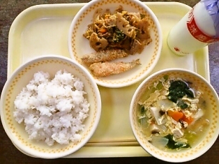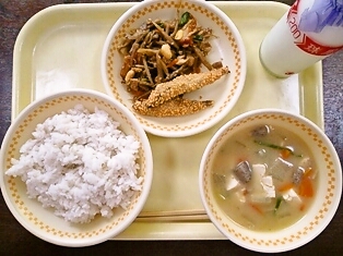 牛乳 麦ごはん きくらげと豆腐のスープ 豚肉と根菜のピリ辛炒め いわしの梅の香あげ