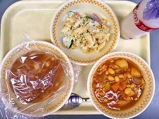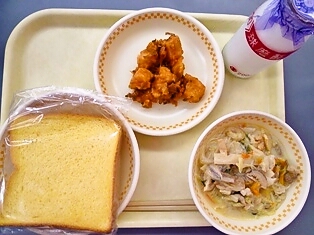 今日の給食は、クラムチャウダーです。クラムチャウダーの「クラム」とは、あさりなどの二枚貝のことで、「チャウダー」はクリームスープのことです。クラムチャウダーに入っている"あさり"には、鉄分が多く含まれています。鉄分が不足すると、貧血になることがあります。体にとってとても大切な栄養素ですので、あさりが苦手な人もまずは一口食べてみてくださいね!