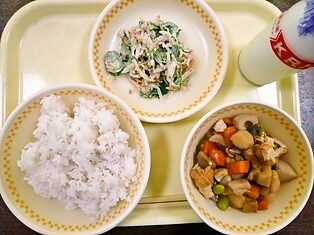 今日の給食は、春のチキンカレーライスです。何がいつもと違うと思いますか?カレーの中を探してもらうと気づくと思いますが、いつもはカレーに入っていない「たけのこ」が入っています。このたけのこは、みなさんが住んでいる津奈木町でとれたたけのこです。歯触りがよく、たけのこの味が苦手な人でも食べやすいと思います。よく噛んで食べてくださいね!