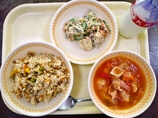 牛乳 豚キムチャーハン 中華五目スープ 切り干し大根のサラダ