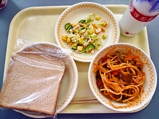 今日の給食は、なすのペンネスパゲティです。今日は、なすを使ったペンネスパゲティです。なすは年中出回ってますが、夏に旬を迎える野菜です。今日のスパゲティは、いつもと違って、ペンネマカロニというものを使っています。マカロニの切り口がペン先のようになっていることから名付けられています。食べるときによく見ながら食べてみて下さい!
