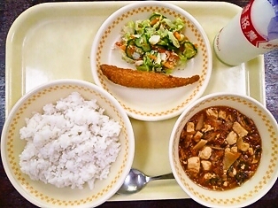 今日の給食は、カレー麻婆豆腐です。今日は、豆腐についてのクイズをしたいと思います。では、問題です。豆腐を初めにつくったのは、どこの国でしょうか? ①冷やっこが好きな日本 ②麻婆豆腐を作った中国 ③キムチ鍋によく使う韓国 答えは、②の中国です。今から2000年以上も前に中国で作られてきました。日本に伝わったのは、奈良時代で、江戸時代になって一般的に広まったそうです。今日の給食も残さず食べて、元気な体を作りましょう!