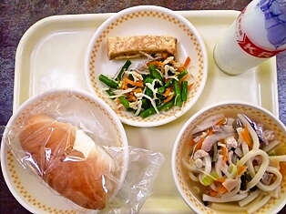 今日の給食は、五目うどんです。五目うどんの『五目』とは、5種類という意味の他に、いろいろなものが混ざっているという意味があります。今日の五目うどんの中にも、たくさんの具材が入っています。何が入っているかわかりますか?油揚げ、にんじん、わかめ、たまねぎ、ねぎ、しいたけ等のたくさんの具材が入っています。どんな具材が入っているか、見つけてみて下さい。