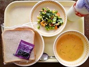 今日の給食は、さつまいもとほうれん草のクリームスープです。今日の給食に入っているさつまいもは、津奈木町で作られたさつまいもです。地元で作られた物を、地元で消費することを「地産地消」と言います。給食でも、できるだけ津奈木町の食材を取り入れるようにしています。今日のさつまいもも、農家の方が心をこめて作られたものです。味わって食べてみて下さいね!