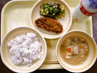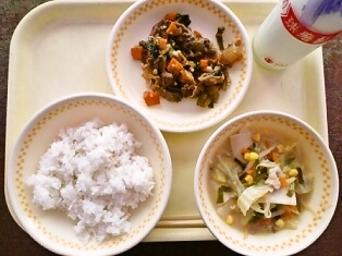 牛乳 ひじきそぼろご飯 豆腐とチンゲンサイの卵スープ 切り干し大根のサラダ