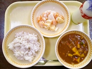 今日の給食は、みなさんに人気のカレーライスです。カレーは、もともとインドで生まれた食べ物です。そのころよく食べられていた羊の肉のにおいを消すために、たくさんのスパイスを使うことをおしゃか様が考え出し、それがカレーの誕生につながったそうです。今日のカレーもごはんと一緒にもりもり食べて下さいね!