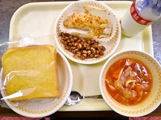 牛乳 黒糖パン 野菜スープ 魚の香草焼き ナッツのりんかけ