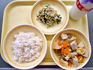 今日の給食は、豚肉と根菜のピリ辛炒めです。みなさん、根菜とはどんな野菜のことか分かりますか?根菜類というと、根を食べる野菜と思われがちですが、土の下に出来る茎などを食べる種類も含みます。今日の給食では、にんじんやれんこんが根菜類です。根菜類には、体を温める効果があります。また、お腹の調子を整えてくれる食物繊維が多く入っています。よく噛んで食べて下さいね!