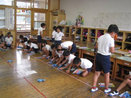教材に使った車は持ち帰りましたので、家庭でも風とゴムの働きについて学習を深めて下さい。