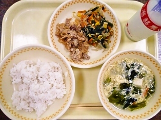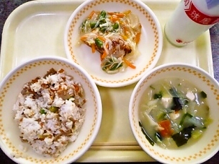 牛乳 ひじきそぼろご飯 豆腐とチンゲンサイの卵スープ 切り干し大根のサラダ