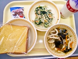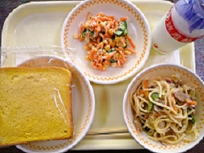 牛乳 にんじんパン 五目うどん 梅マヨ和え 一食アーモンド