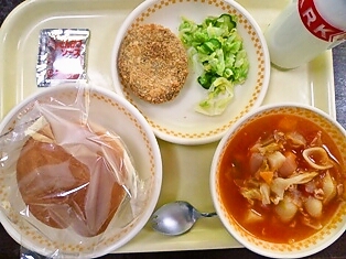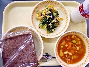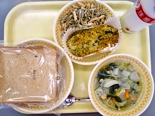 今日の給食は、かぼちゃのみそ汁です。みなさんは、地産地消という言葉を知っていますか?地産地消とは、地元で作られた食べ物を、地元で食べることです。今日のかぼちゃは、みなさんが住んでいる津奈木町で作られたかぼちゃです。地元で育てられた、おいしくて新鮮なかぼちゃです。味わって食べてみて下さいね。