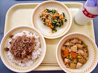 今日の給食は、春のチキンカレーライスです。何がいつもと違うと思いますか?カレーの中を探してもらうと気づくと思いますが、いつもはカレーに入っていない「たけのこ」が入っています。このたけのこは、みなさんが住んでいる津奈木町でとれたたけのこです。歯触りがよく、たけのこの味が苦手な人でも食べやすいと思います。よく噛んで食べてくださいね!