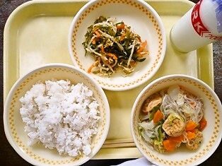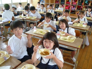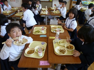 今日は、みんなが大好きなカレーでした。1年生も給食2日目ですが、「給食おいしいです!」と言いながらモリモリ食べていました。学校生活に写真も載せてあるので、ご覧ください。