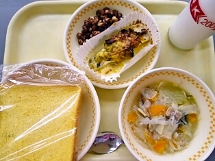 今日の給食は、チーズ入り卵焼きです。チーズには、色々な種類があり、表面が白カビで覆われている物や、ブルーチーズと呼ばれる青カビを利用したチーズなどもあります。今日のチーズは、プロセスチーズと呼ばれているもので、日本でもよく食べられているチーズです。チーズには、骨や歯を強くするカルシウムがたくさん含まれています。今日のチーズ入り卵焼きも、残さずしっかり食べて下さいね!