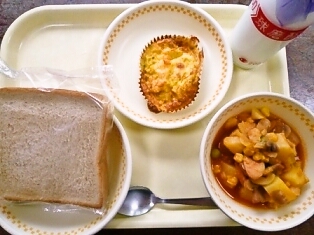 かぼちゃパン 牛乳 春雨スープ 魚のチーズ焼き チョコタッフィー