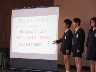 児童集会で運営委員会が今年度の児童会目標の振り返りを行いました。